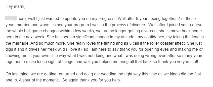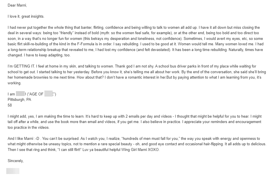 The Wing Girl Method, Marni, Wing Girls and our licensors or suppliers make no representations or warranties concerning any treatment, action, or application of medication or preparation by any person following the information offered or provided herein. Neither Marni Kinrys nor our associates, or any of their affiliates, will be liable for any direct, indirect, consequential, special, exemplary or other damages that may result, including but not limited to economic loss, injury, illness or death. These materials are provided for entertainment purposes only. Your results and experience may be different from any claims or testimonials on this site. The FTC requires that we identify what a "typical" result is. Typically people never do anything with products or information they buy, so in most cases they will not get any results. The statements and photos you see on our pages are examples of individuals that took action and the results are not typical. If you're looking for results, you need to take action and stick to the plan.