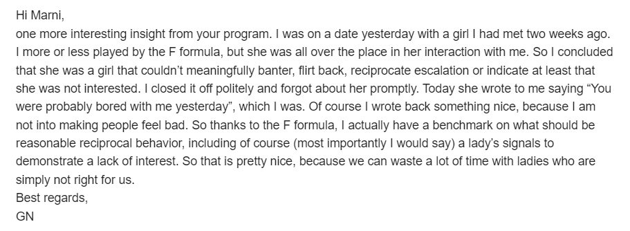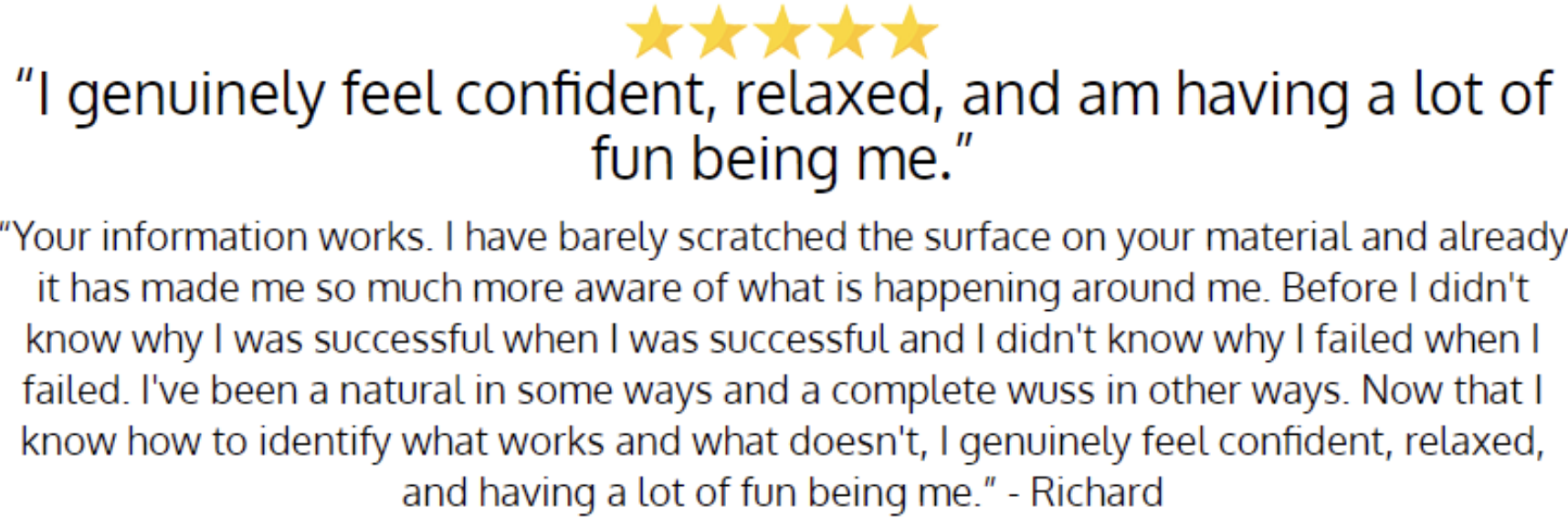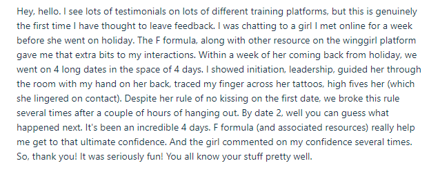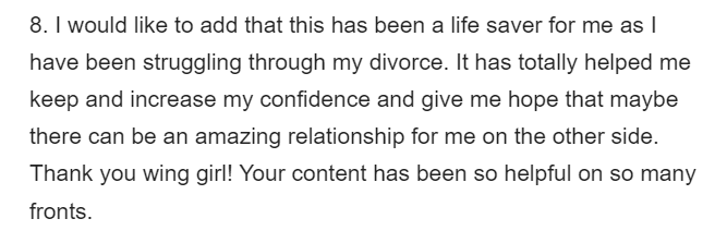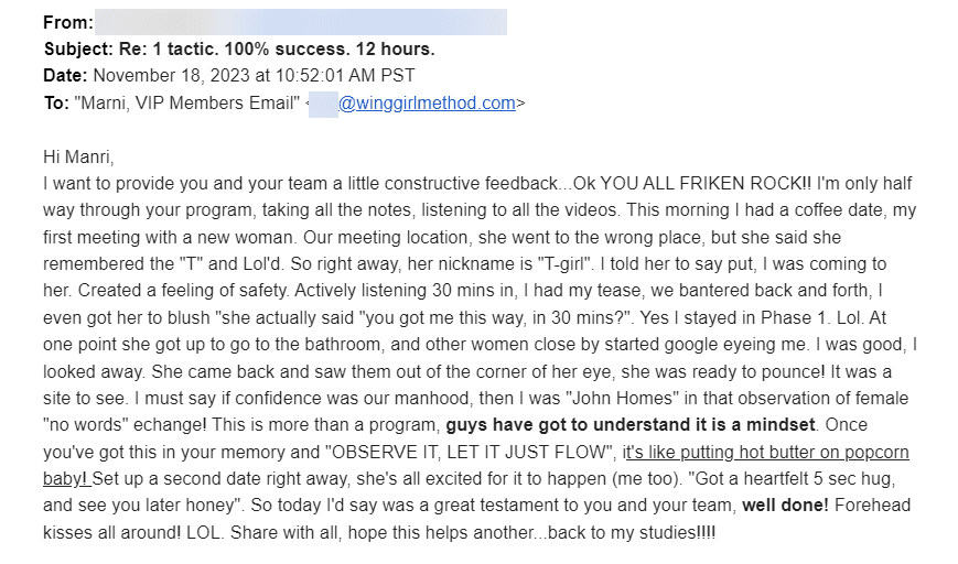 The material on this site may not be reproduced, distributed, transmitted, cached, or otherwise used, except with the prior written permission of Wing Girl Method. This website is an educational service that provides general information. The information contained in or made available through this Product cannot and is not intended to replace or substitute for the services of trained professionals in any field, including, but not limited to, psychological, financial, medical, or legal matters. In particular, you should regularly consult a doctor in all matters relating to physical or mental health, particularly concerning any symptoms that may require diagnosis or medical attention.