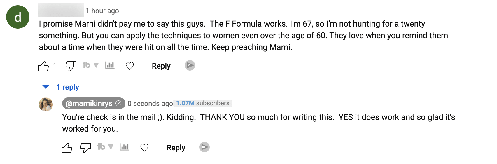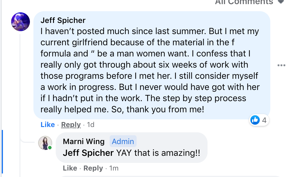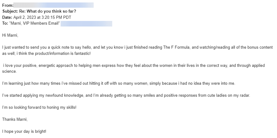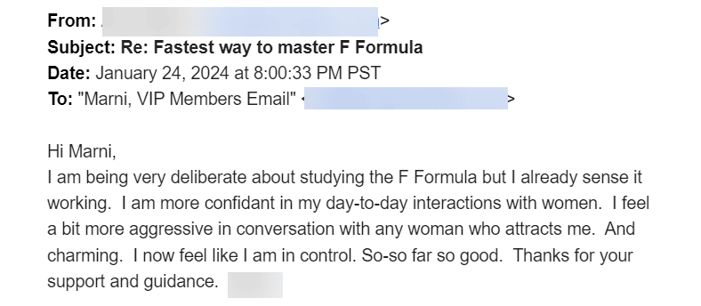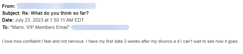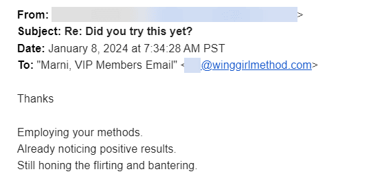 The Wing Girl Method, Marni, Wing Girls and our licensors or suppliers make no representations or warranties concerning any treatment, action, or application of medication or preparation by any person following the information offered or provided herein. Neither Marni Kinrys nor our associates, or any of their affiliates, will be liable for any direct, indirect, consequential, special, exemplary or other damages that may result, including but not limited to economic loss, injury, illness or death. These materials are provided for entertainment purposes only. Your results and experience may be different from any claims or testimonials on this site. The FTC requires that we identify what a "typical" result is. Typically people never do anything with products or information they buy, so in most cases they will not get any results. The statements and photos you see on our pages are examples of individuals that took action and the results are not typical. If you're looking for results, you need to take action and stick to the plan.